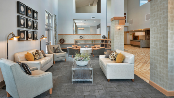 This 48,034 square foot, single story assisted living facility gives residents access to an ice cream shop, hair salon, garden rooms and a theater. There is also a physical therapy room for residents to work with physical therapists on their mobility.