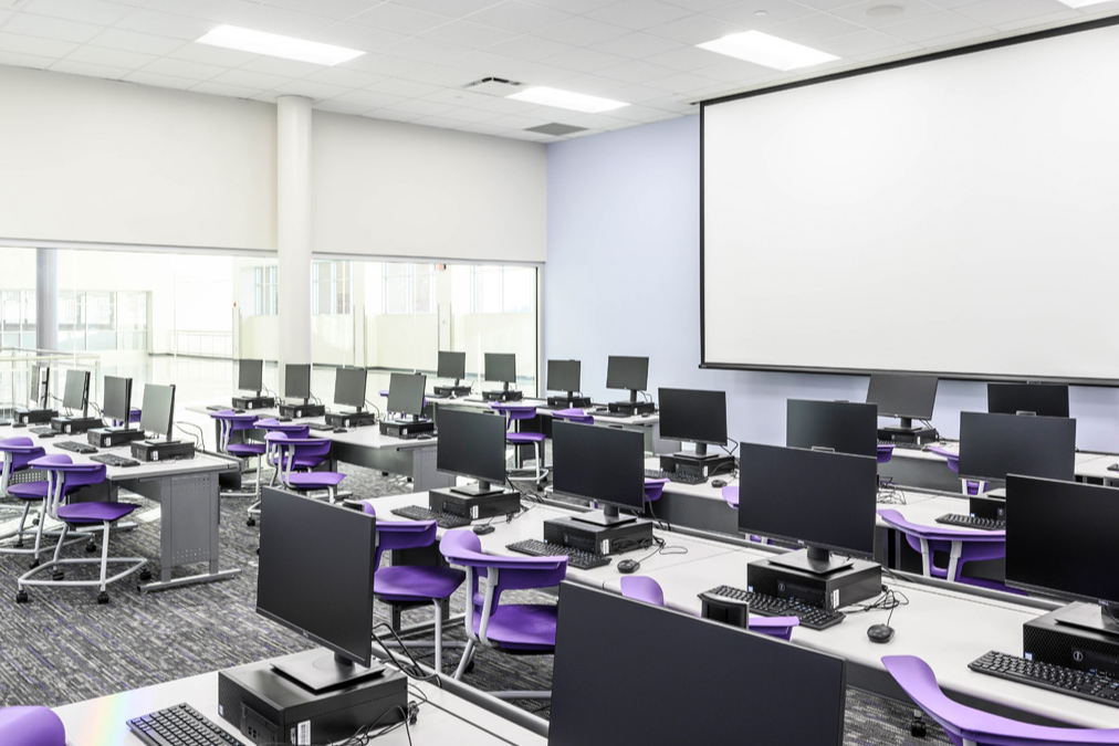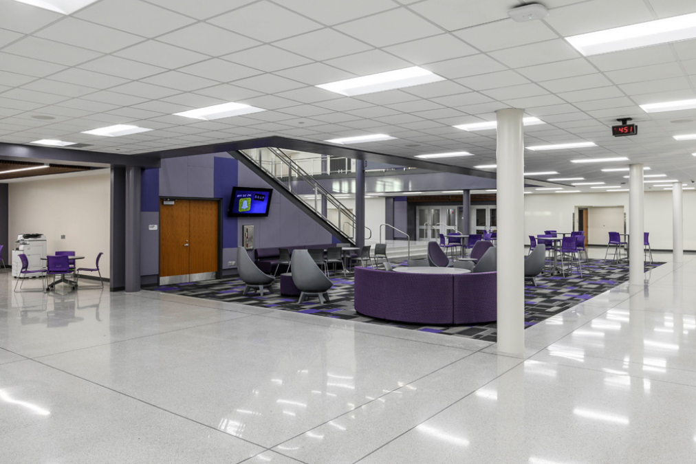 Designed to serve over 2,000 students on a daily basis, the 9,000-square foot kitchen features three double sided cooking hoods, a walk-in freezer and cooler, heated/cooled pass throughs for food prep and serving, dish washing room and office space. Located on the west side of the school, the 22,000-square foot cafeteria was designed with full height windows to provide natural light throughout the space. It features a serving line with a pizza station, chef central action station, grilled food stations, sandwich shop and a coffee bar. Students have the option of sitting at booth style stables, high top seating along full height windows, bar top style seating equipped with USB outlets for computer/cell phone charging or standard round tables. The room was wrapped with fabric acoustic panels to help with noise control.