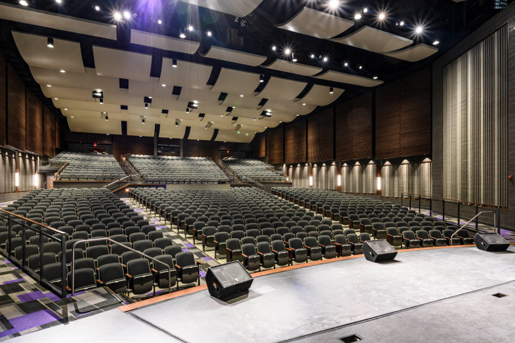 With a seating capacity of over 1,000, the auditorium was constructed with sound absorbing and deflecting CMU blocks, which were backed by a metal stud and drywall wall. By using CMU blocks low frequency sounds can be absorbed, where the metal stud and drywall help absorb high frequency sounds. The ceiling features hanging drywall clouds which aid in hiding the above head rough ins, as well as provide a particular acoustical value to the room.