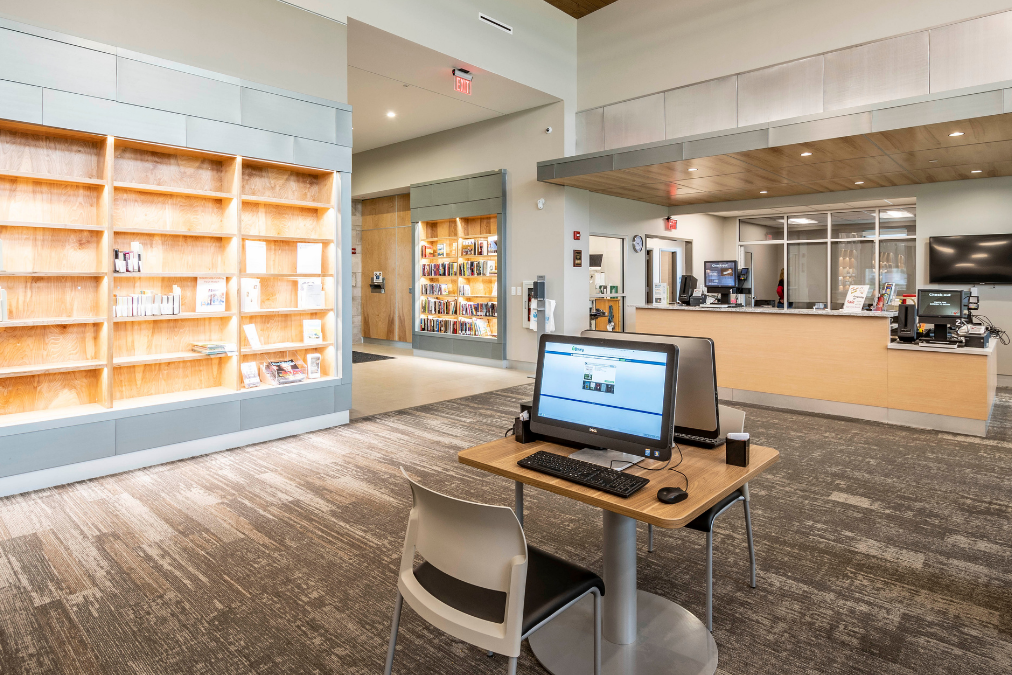 Built to take advantage of natural light, the 15,000-square foot, single story library doubles the size of the areas original building. The new library features quality finishes and detailing with brick, stone and zinc pane façade. It also includes a large children’s area, designated teen section, additional study and lounging areas, large meeting and youth programming rooms, adult sections, a circulation desk, a patio seating area, as well as employee offices, storage space and break room.