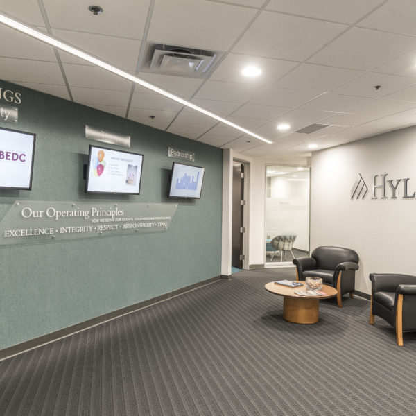 Hylant Group INDIANAPOLIS, INDIANA 10,375 SF tenant improvement with an office renovation within the Meridian Plaza office building that included new iPad stations for scheduling conference rooms.