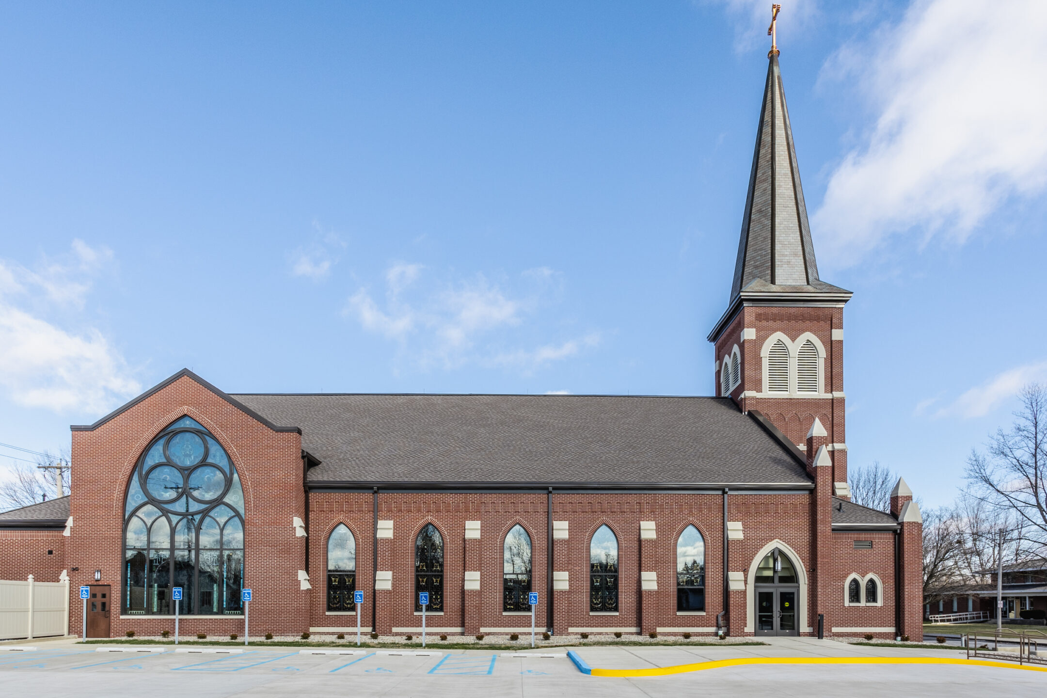 This historical significance warranted a different construction approach. The owner salvaged as many materials from the existing building—the steeple, bells, pews, and stained-glass windows to name a few. When construction began, careful consideration was made to ensure the 11,300-square foot brick building was made in close likeness to the original.