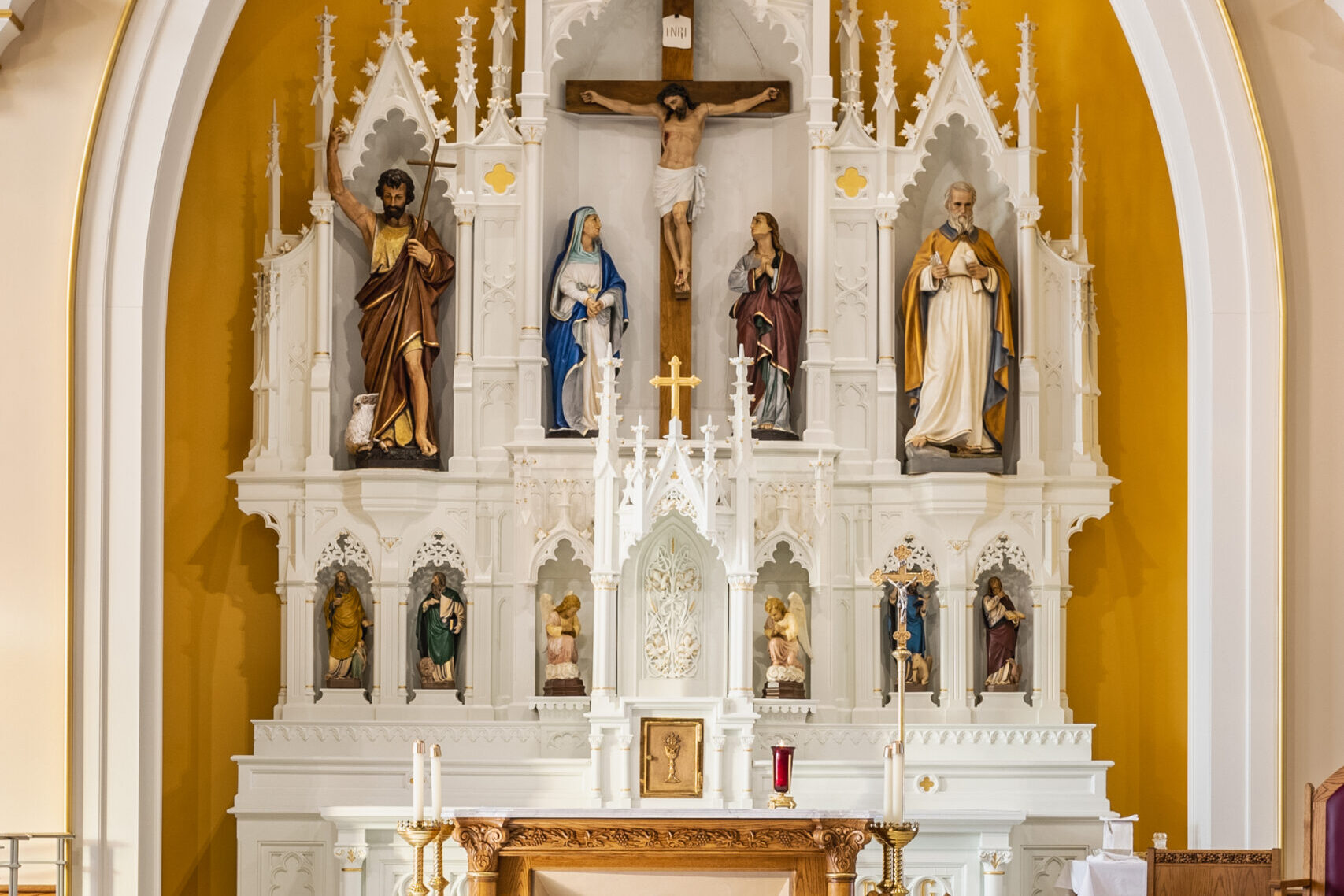 The new church features traditional attributes as well as unique architectural features, most significantly a large, barrel vault ceiling and inset worship spaces. St. John the Baptist Church was unveiled in November 2022 when the congregation held its first mass.